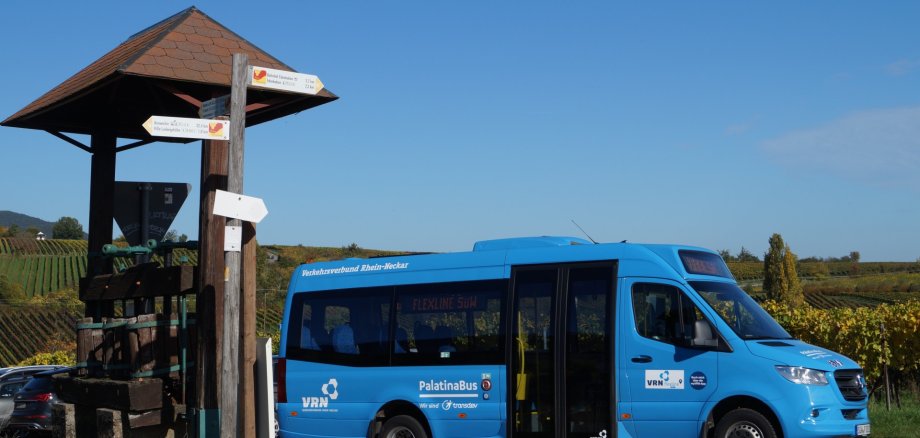 Der On-Demand-Verkehr VRNflexline hält außerdem an zahlreichen weiteren Haltepunkten in Altdorf, Böbingen, Edenkoben, Edesheim, Freimersheim, Gommersheim Großfischlingen, Hochstadt, Kleinfischlingen, Venningen sowie, wie dargestellt, seit 1. Dezember an Wochenenden und Feiertagen auch in Rhodt und Weyher.