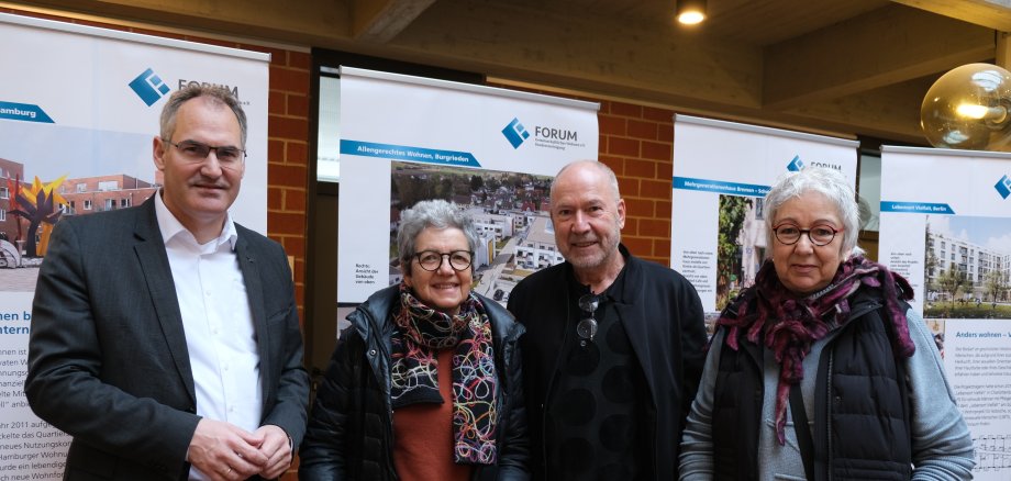Der Edenkobener Architekt Alexander Grünenwald vom Büro Grünenwald + Heyl . Architekten, gleichzeitig Geschäftsführer der BauWohnberatung Karlsruhe, einer Regionalstelle des Forums Gemeinschaftliches Wohnen e.V., führte inhaltlich in die Ausstellung ein. Als Besonderheiten des gemeinschaftlichen Wohnens, das in vielerlei Form möglich sei, nannte er nicht nur die Möglichkeit zum selbstbestimmten Leben und zum Talentetausch oder die Hilfe bei Kinderbetreuung. Auch werde Einsamkeit entgegengewirkt, Werkzeuge und Ressourcen könnten in Anbetracht des Klimawandels miteinander genutzt werden, und „gemeinsames Handeln in überschaubaren Zusammenhängen“ werde möglich. Mit Gleichgesinnten aus der Bürgerschaft heraus zum sinnstiftenden Handeln und Einflussnehmen zu kommen, sei gerade in Zeiten, in denen der gesellschaftliche Zusammenhalt in Frage stehe, wertvoll, so Grünenwald, der nicht nur aus Expertenperspektive, sondern auch aus persönlicher berichtete. Denn er hat als Architekt und Projektbegleiter diverse Wohnprojekte betreut und lebt selbst in einer gemeinschaftlichen Wohnform, im LudwigsPalast in Edenkoben, dem umgebauten denkmalgeschützten Gebäude der ehemaligen Ludwigsschule. „Wir produzieren unsere guten Nachrichten vor Ort“, so Grünenwald, der auch auf das monatlich stattfindende Repaircafé LudwigsWerkstätten e.V. verwies, bei dem es ums Reparieren statt Wegwerfen geht.