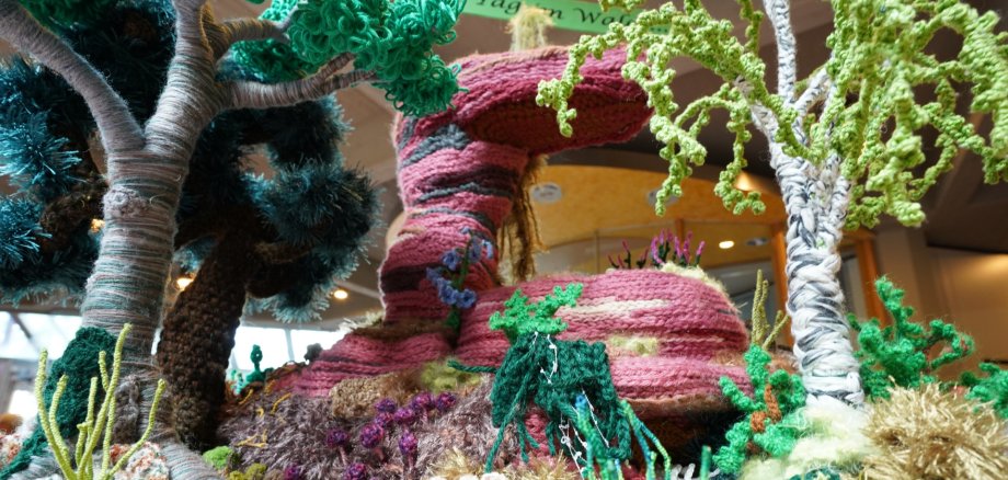 Rückblick: Die Künstlerin Konnie Keller und Dorothea Hafer, Vorsitzende des Vereins Kultur und Kunst Leinsweiler e. V., hatten gemeinsam mit über hundert fleißigen Helferinnen und Helfern sowie vier Schulklassen dieses außergewöhnliche Kunstwerk geschaffen. Pilze, Pflanzen, Bäume und Flechten aus Sisal und verschiedenen Wollsorten ergeben nun ein kunstvolles Abbild des Pfälzerwaldes, das die Einzigartigkeit und Empfindlichkeit dieses Ökosystems eindrucksvoll darstellt.