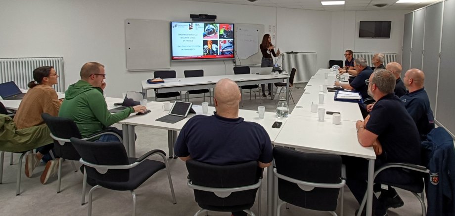 Brand- und Katastrophenschutzinspekteur Jens Thiele erklärt: „Um unsere Zusammenarbeit über die Landesgrenzen hinweg zu stärken, bildet der Landkreis Südliche Weinstraße derzeit sechs Frauen und Männer aus den Reihen unseres Katastrophenschutzes aus, die zukünftig bei grenzüberschreitenden Einsätzen und Übungen als Verbindungspersonen zu den französischen Einsatzkräften fungieren. Dazu ist es wichtig, die französischen Verbindungsoffiziere und das System des französischen Brand- und Katastrophenschutzes zu kennen.“ Dieses erläuterten die französischen Kollegen in der gemeinsamen Besprechung. Kommuniziert wird auf Deutsch oder Französisch. Die angehenden Verbindungspersonen auf dem Kreis SÜW sprechen alle Französisch und lernen darüber hinaus die wichtigsten französischen Fachbegriffe.