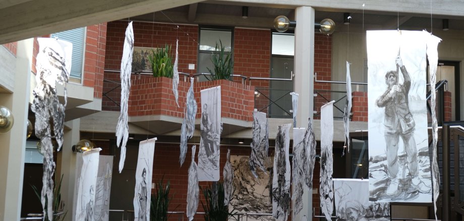 Seefeldt hob hervor, dass die Arbeit „Tabak“ 2024 sogar mit dem Publikumspreis des Pfalzpreises für Bildende Kunst ausgezeichnet worden war. Kaufmann nutzte als Vorlagen für die Installation Schwarzweißfotografien seines Großvaters. „Das Schwarzweiß der Fotos findet sich nun im Ton der Tusche wieder“, bemerkte Tina Stolt, Professorin für Bildnerische Praxis am Institut für Kunstwissenschaft und Bildende Kunst an der RPTU. Sie führte bei der Ausstellungseröffnung in die Schau ihres Kollegen Kaufmann ein. „Diese Arbeit geht ins Konkrete, zeigt Familiengeschichte“, so Stolt, für die die Tabak-Zeichnungen auch dokumentarischen Anspruch erheben: „Landschaft, Acker, Gerätschaften sind deutlich zu sehen, aber nicht gänzlich. Sie entziehen sich – wie in einem Traum oder einer flüchtigen Erinnerung – dann auch wieder der Vorstellung.“ Die außergewöhnliche Installation hat der Künstler so aufgehängt, dass sie in der Mitte des über zwei Stockwerke hinaufreichenden offenen Foyers des Kreishauses zu schweben scheint.