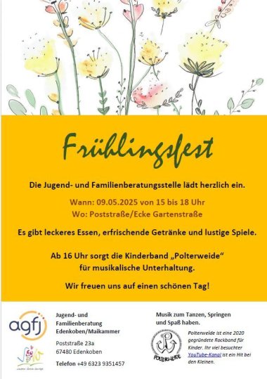 Am nächsten Tag ist Herxheim dran: In der Jugend- und Familienberatungsstelle (Adresse: Am Rathaus 1) wird ebenfalls ein Frühlingsfest gefeiert. Gäste erwartet neben leckerem Essen und erfrischenden Getränke hier zwischen 13 und 17 Uhr ein Angebot an Spielen, Bastel-Stationen und weiteren tollen Aktionen für die ganze Familie.