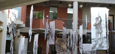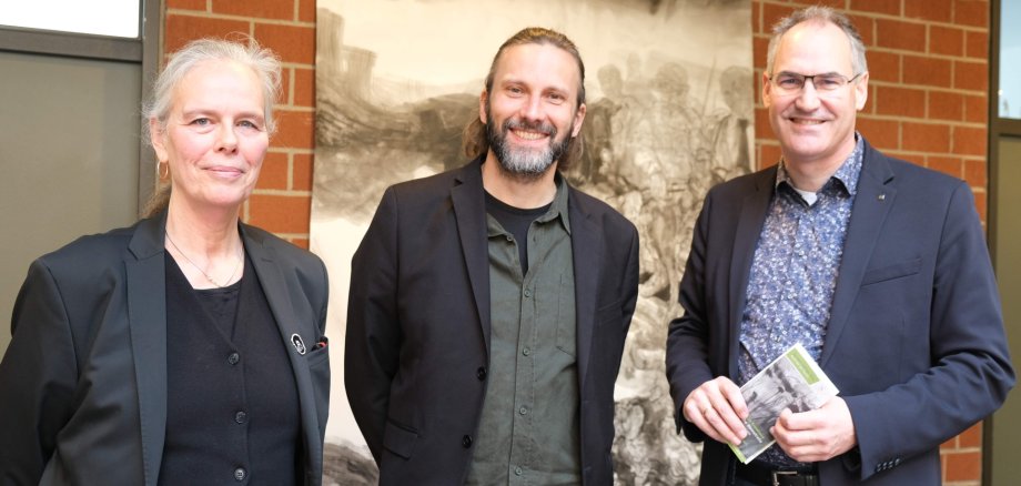 Seefeldt hob hervor, dass die Arbeit „Tabak“ 2024 sogar mit dem Publikumspreis des Pfalzpreises für Bildende Kunst ausgezeichnet worden war. Kaufmann nutzte als Vorlagen für die Installation Schwarzweißfotografien seines Großvaters. „Das Schwarzweiß der Fotos findet sich nun im Ton der Tusche wieder“, bemerkte Tina Stolt, Professorin für Bildnerische Praxis am Institut für Kunstwissenschaft und Bildende Kunst an der RPTU. Sie führte bei der Ausstellungseröffnung in die Schau ihres Kollegen Kaufmann ein. „Diese Arbeit geht ins Konkrete, zeigt Familiengeschichte“, so Stolt, für die die Tabak-Zeichnungen auch dokumentarischen Anspruch erheben: „Landschaft, Acker, Gerätschaften sind deutlich zu sehen, aber nicht gänzlich. Sie entziehen sich – wie in einem Traum oder einer flüchtigen Erinnerung – dann auch wieder der Vorstellung.“ Die außergewöhnliche Installation hat der Künstler so aufgehängt, dass sie in der Mitte des über zwei Stockwerke hinaufreichenden offenen Foyers des Kreishauses zu schweben scheint.