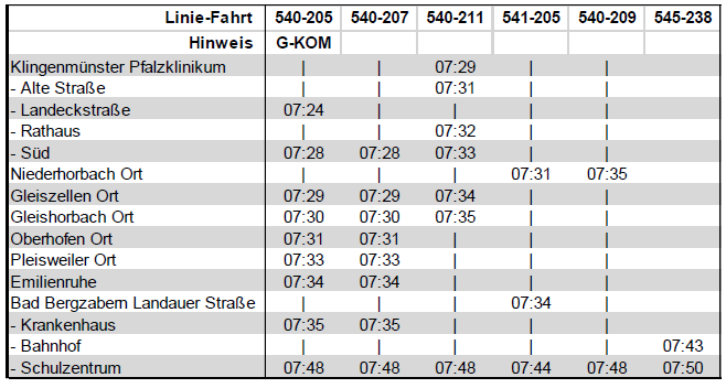 Die Linie 531 wird innerörtlich umgeleitet. Die Haltestellen Klingenmünster Rathaus und Klingenmünster Alte Straße können umleitungsbedingt nicht bedient werden. Fahrgäste werden gebeten auf die im Magdalenenweg eingerichtete Ersatzhaltestelle mit den Abfahrtszeiten der Haltestelle Klingenmünster Alte Straße auszuweichen.Linie 540: Bad Bergzabern - Klingenmünster - Billigheim-Ingenheim – Landau